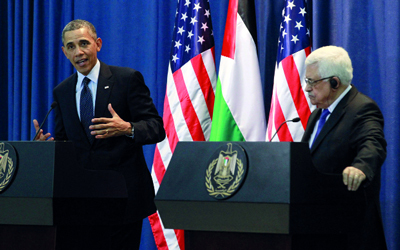 جدد الرئيس الفلسطيني محمود عباس، التزام السلطة الفلسطينية بحل الدولتين وتنفيذ العهود الدولية لإحلال السلام في المنطقة، فيما شدد الرئيس الأميركي باراك أوباما، على سعي واشنطن لإقامة دولة فلسطينية كاملة السيادة الى جانب دولة يهودية عبر المفاوضات، وقال إن على الفلسطينيين أن يدركوا أن إسرائيل ستكون دولة يهودية، وأضاف «حان الوقت ليتخذ العرب خطوات نحو التطبيع مع إسرائيل»،