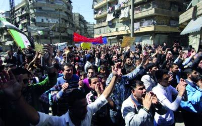 تظاهرة حاشدة تطالب بإسقاط نظام الأسد في حي بستان القصر وسط مدينة حلب. رويترز