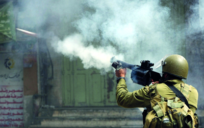 جندي إسرائيلي يطلق قنبلة غاز مسيل للدموع خلال اشتباكات مع فلسطينيين في الخليل عقب وفاة أبوحمدية. أ.ف.ب