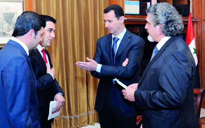 الأسد يتحدث مع صحافيين من قناة «أولوصال» التلفزيونية وصحيفة «أيدنليك» التركيتين. أ.ف.ب