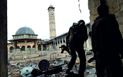 مقاتلان من الجيش الحر وسط الدمار الذي لحق بالمسجد الأموي الكبير في مدينة حلب جراء قصفه من قبل القوات النظامية. أ.ف.ب