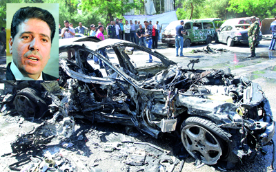 جانب من آثار تفجير المزة وسط دمشق.. وفي الإطار رئيس الوزراء وائل الحلقي. أ.ف.ب