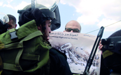 فلسطيني يحمل ملصقاً لحق العودة خلال تظاهرة ضد الجدار في قرية الولجة قرب بيت لحم. أ.ف.ب