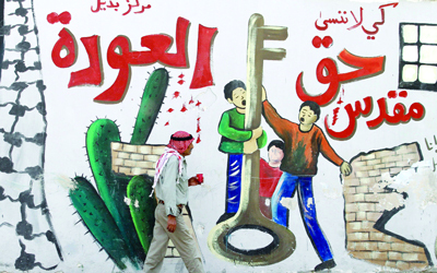 فلسطيني يمشي أمام لوحة جدارية على حائط في مدينة جنين استعدادا لإحياء ذكرى النكبة. أ.ف.ب