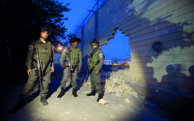 شرطة الاحتلال تحرس قسماً من الجدار الفاصل بعد تدمير جزء منه في قرية أبوديس على مشارف القدس. أ.ف.ب