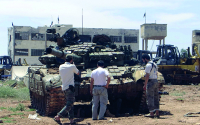 مقاتلون من الجيش الحر يقفون أمام دبابة تابعة للقوات السورية بعد أن استولوا على معسكر الشبيبة قرب بلدة النيرب بحلب. رويترز