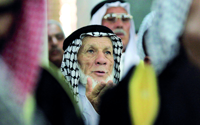 عراقي يرفع يديه بالدعاء لوقف العنف خلال صلاة الجمعة في أحد مساجد بغداد. أ.ف.ب