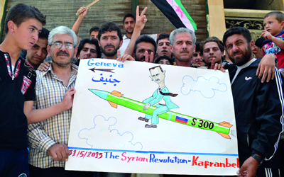 متظاهرون في بلدة كفرنبل بريف إدلب يحملون لافتة تدين تسليح روسيا للأسد بصواريخ إس 300 لدعمه قبل مؤتمر جنيف 2. أ.ف.ب