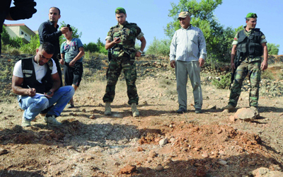 عناصر من الجيش اللبناني في موقع سقوط أحد الصواريخ قرب الحدود مع سورية. أ.ف.ب
