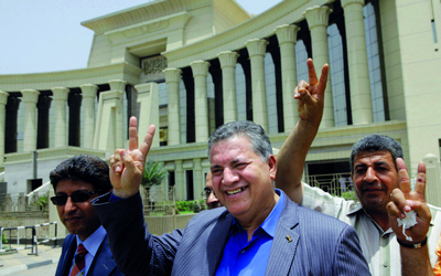 معارضون مصريون يرفعون شارة النصر عقب حكم المحكمة الدستورية أمس. أ.ب