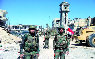 عناصر من القوات السورية النظامية أمام برج الساعة في الساحة الرئيسة لمدينة القصير. أ.ف.ب
