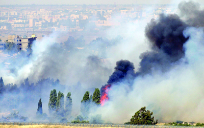 الدخان يتصاعد نتيجة الاشتباكات في القنيطرة بالجولان حيث سيطرت عليها المعارضة لساعات. أ.ف.ب