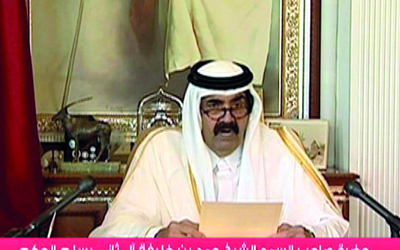 حمد بن خليفة في خطابه للشعب القطري أمس. صورة تلفزيونية - أ.ف.ب