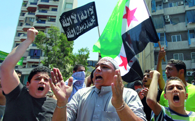 أنصار الأسير يرفعون علم الثورة السورية خلال تظاهرة في بيروت. أ.ب