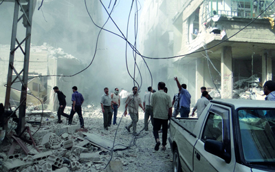 سوريون يتفقدون الأضرار في أعقاب غارة نفذتها القوات النظامية على مدينة عربين في ضواحي دمشق. أ.ف.ب