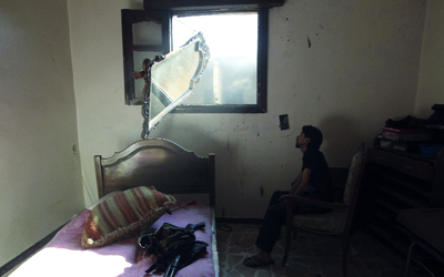 مقاتل من الجيش الحر يستخدم مرآة لمراقبة القناصة الموالين للأسد في حي صلاح الدين بحلب. رويترز