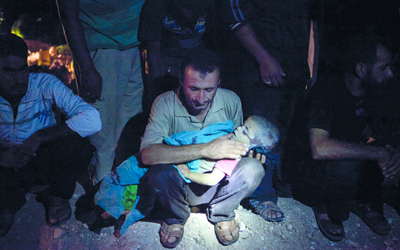 سوري يبكي وهو يحمل جثة ابنه الذي قتل وأخته بسقوط قذيفة على منزلهم وقت الإفطار في معرة النعمان بريف إدلب. أ.ف.ب