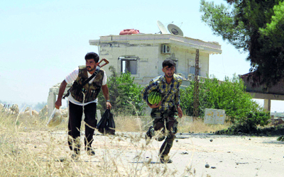 عنصران من «الجيش الحر» يتفاديان قناصة الأسد خلال جلبهما الطعام في إدلب. أ.ف.ب