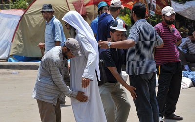 أنصار مرسي يفتشون الداخلين إلى ميدان النهضة بعد اشتباكات دامية. إي.بي.إيه