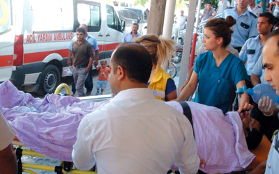 أتراك يسعفون شاباً أصيب برصاصة طائشة أطلقت عبر الحدود مع سورية في جيلان بينار. أ.ف.ب