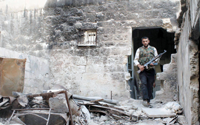 مقاتل من الجيش الحر في إحدى ضواحي حلب التي تدور فيها اشتباكات. رويترز
