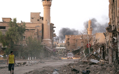 شاب يمشي في شارع مملوء بالحطام ويظهر خلفه دخان ناجم عن حريق إثر قصف القوات النظامية على مدينة دير الزور. رويترز