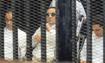 وفي اكاديمية الشرطة، جلس مبارك (85 عاماً) وهو يضع نظارات سوداء داخل قفص الاتهام في المحكمة، إلى جانب وزير داخليته حبيب العادلي ومتهمين آخرين ونجليه علاء وجمال، بحسب ما اظهرت لقطات من التلفزيون الرسمي الذي بث الجلسة بشكل مباشر.