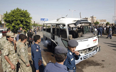 عناصر من الشرطة والجيش في موقع الحافلة المستهدفة. أ.ب