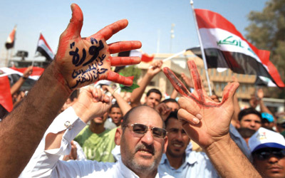 احتجاجات في البصرة ضد امتيازات البرلمانيين ورواتب تقاعد الرئاسات الثلاث أمس. أ.ب