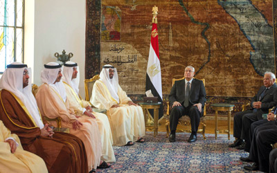 بحث الفريق أول سمو الشيخ محمد بن زايد آل نهيان ولي عهد أبوظبي نائب القائد الأعلى للقوات المسلحة، مع الرئيس المصري المؤقت، المستشار عدلي منصور، ورئيس الوزراء، حازم الببلاوي، والنائب الأول لرئيس مجلس الوزراء وزير الدفاع والإنتاج الحربي القائد العام للقوات المسلحة المصرية، الفريق أول عبدالفتاح السيسي، العلاقات الأخوية والتعاون المشترك بين الإمارات ومصر، وذلك عقب وصول سموه إلى القاهرة في زيارة أخوية التقى خلالها كبار المسؤولين المصريين، وسط احتفاء وترحيب شعبي واسع، حيث أكد سموه ارتياح الإمارات لعودة الأمن والاستقرار إلى مصر، فيما أكدت الخارجية المصرية تقديرها وتثمينها لموقف الإمارات رئيساً وحكومة وشعباً لوقوفها إلى جانب إرادة الشعب المصري خلال هذه المرحلة الدقيقة التي تمر بها مصر، فيما أكدت الرئاسة المصرية استمرار مصر في التزامها بأمن الخليج باعتباره أحد الروافد الاساسية لمنطقة الأمن الاستراتيجي والقومي المصري، وشدد على اهتمام مصر بتطوير العلاقات بين البلدين مستقبلاً في شتى المجالات.