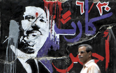 مصري يسير بجوار جدارية مناهضة للرئيس المعزول محمد مرسي في أحد شوارع القاهرة. رويترز