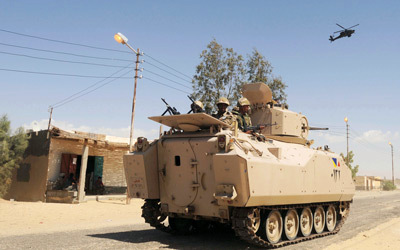 قوات عسكرية بالقرب من منطقة الشيخ زويد شمال سيناء لمحاربة الإرهاب. أ.ب