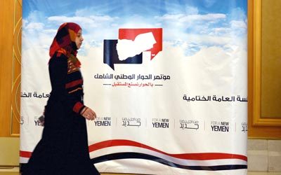 يمنية تمشي بجوار لافتة للحوار الوطني خلال مؤتمر الحوار الذي تدعمه الأمم المتحدة في صنعاء. إي.بي.ايه