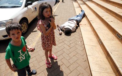 طفلان مذعوران بجوار جثة إحدى ضحايا الهجوم. رويترز