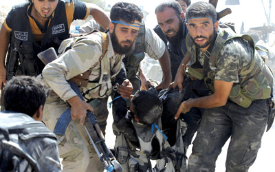 عناصر من الجيش السوري الحر يحملون مصاباً خلال المواجهات مع قوات النظام في حلب. رويترز