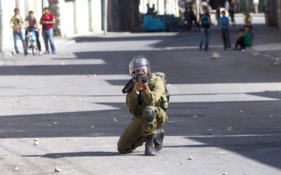 جندي إسرائيلي يصوب سلاحه تجاه متظاهرين فلسطينيين في الخليل خلال مواجهات عقب مقتل جندي آخر. أ.ف.ب
