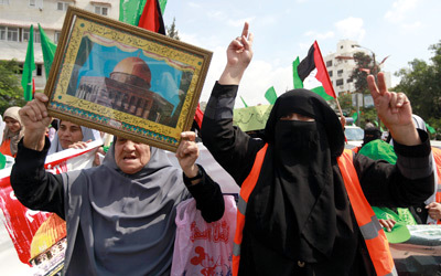 وانطلقت آلاف عدة من عناصر وأنصار حركة المقاومة الإسلامية (حماس) من أمام مقر «السرايا» وسط مدينة غزة باتجاه مقر المجلس التشريعي، حيث تجمعوا هناك بمشاركة عدد من القادة البارزين للحركة. ورفع المتظاهرون، وبينهم مئات النساء، وعناصر شرطة «حماس» لافتات تدعو المقدسيين إلى «الثورة ضد الاحتلال» الإسرائيلي في القدس ومنها «حان الآن وقت النفير، الأقصى يستغيث ثورة ضد المحتل»، و«أقصانا لا هيكلكم». وردد المتظاهرون هتافات منها «نقسم بالله أن نحمي المسجد الأقصى ومدينة القدس وألا نفرط وألا نتنازل عن شبر منهما وألا نقبل اجتزاء جزء منهما».