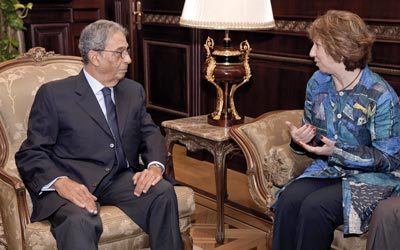عمرو موسى خلال اجتماعه مع كاترين آشتون أمس بالقاهرة. رويترز