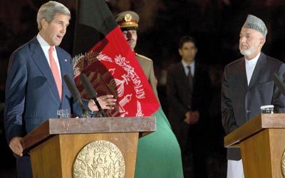 كرزاي وكيري بعد الإعلان عن الاتفاق الأمني في كابول. أ. ف. ب