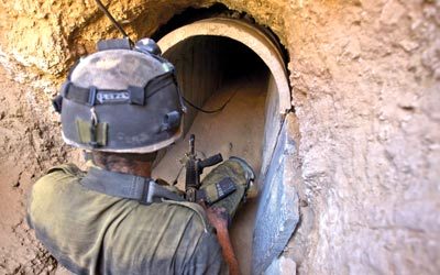 جندي إسرائيلي عند مدخل أحد الأنفاق في إطار الحملة الإسرائيلية ضد حفرها. إي.بي.إيه