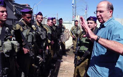 وزير الدفاع الإسرائيلي موشي يعلون يتحدث مع مجموعة من الجنود الإسرائيليـين في الخليل. إي.بي.إيه