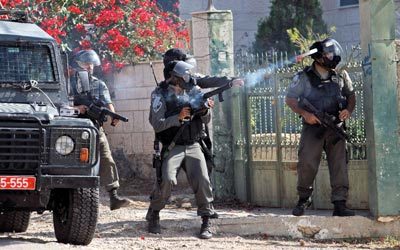 جندي إسرائيلي يطلق الغاز المسيل للدموع على متظاهرين فلسطينيين. إي.بي.إيه