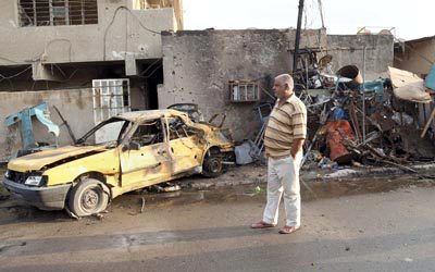 عراقي بجوار سيارة تم تفجيرها في بغداد. أ.ب