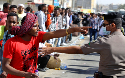 إثيوبي يتجادل مع شرطي قبـيل ترحيله وآخرين. رويترز