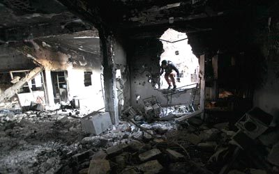 مقاتل من الجيش السوري الحر يقفز من مبنى مدمر في دير الزور نتيجة قصف قوات النظام. رويترز