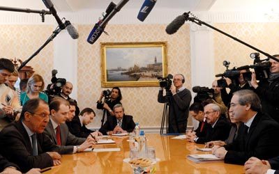 لافروف بحث مع المقداد وشعبان التحضيرات لمؤتمر ”جنيف2” المزمع عقده لحل الأزمة السورية. أ.ف.ب
