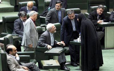 جواد ظريف خلال كلمته أمام مجلس الشورى الإيراني أمس. أ.ب