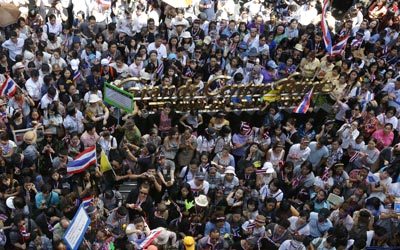 حشود من المتظاهرين في عاصمة تايلاند مطالبين برحيل حكومة ينغلوك شيناواترا. إي.بي.إيه