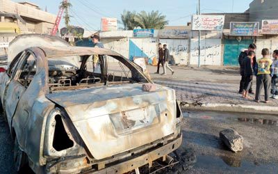 سيارة محترقة نتيجة تفجير في منطقة البياع غربي بغداد. أ.ف.ب