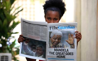 شغل نيلسون مانديلا، أمس، الصفحات الأولى للصحف في جميع أنحاء العالم، حيث صدرت معظم صحف موطنه بالأبيض والأسود. وصدرت صحف عديدة بعنوان بلغة «الكوزا» التي ينتمي إليها مانديلا واستخدمت «ماديبا» الاسم الذي يطلقه عليه أهل بلده. وعنونت معظم الصحف «ارحل بسلام ماديبا» (هامبا كالي ماديبا). وكتبت صحيفة دي بورغر التي تصدر بلغة الأفريكان «لقد رحل». أما صحيفة «سويتان» فكتبت «وداعا تاتا» (وداعا يا أبي). أما صحيفة «ذي ستار» فقد عنونت «العالم يبكي» و«جنوب إفريقيا في حداد» وحرمت من «بطل الإنسانية».